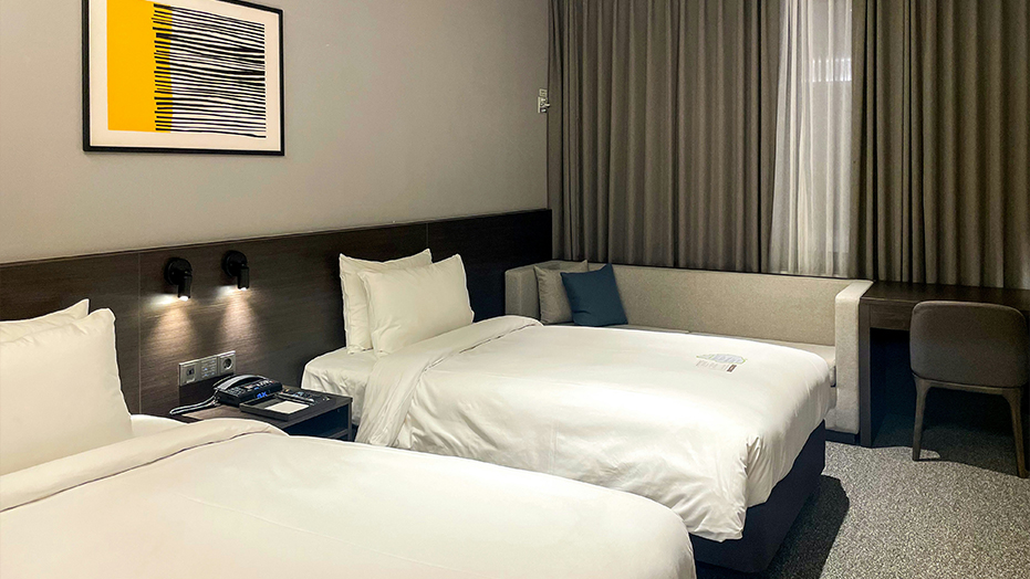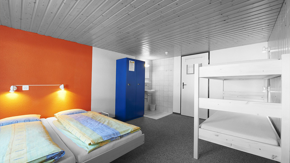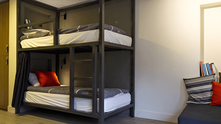 There are six single beds, often with sturdy frames, comfortable mattresses, and simple bedding, like blankets, sheets, and pillows. Each bed might have a small nightstand or a storage unit beside it for personal belongings. In addition to the nightstands, there are usually built-in wardrobes or dressers for each person to store their clothes and personal items. Some rooms may feature under-bed storage to save space.