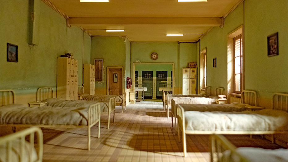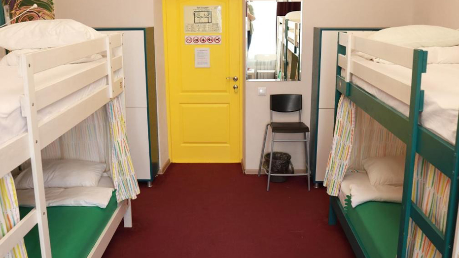 There are six single beds, often with sturdy frames, comfortable mattresses, and simple bedding, like blankets, sheets, and pillows. Each bed might have a small nightstand or a storage unit beside it for personal belongings. In addition to the nightstands, there are usually built-in wardrobes or dressers for each person to store their clothes and personal items. Some rooms may feature under-bed storage to save space.